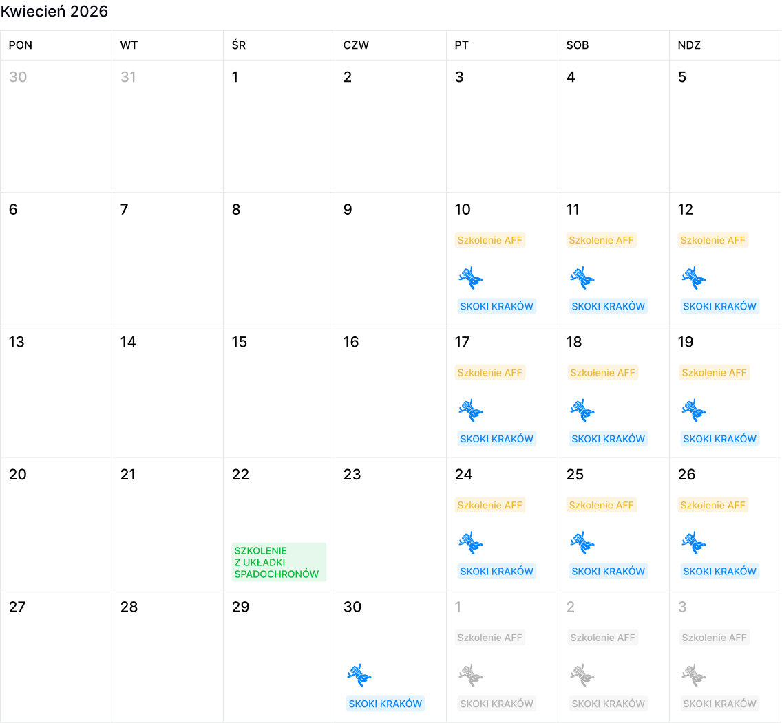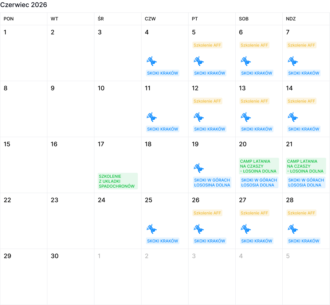 W strefie skoczka znajdziesz wszystko, co potrzebne do maksymalizacji Twojego doświadczenia ze skoków spadochronowych. Od pakietów skoków, które otwierają przed Tobą szersze możliwości, po kalendarz eventów, dzięki któremu nie przegapisz żadnej okazji do podniebnych przygód. To miejsce, gdzie pasja spotyka się z możliwościami – idealne dla każdego, kto chce więcej niż tylko skok.
